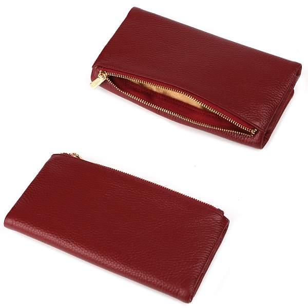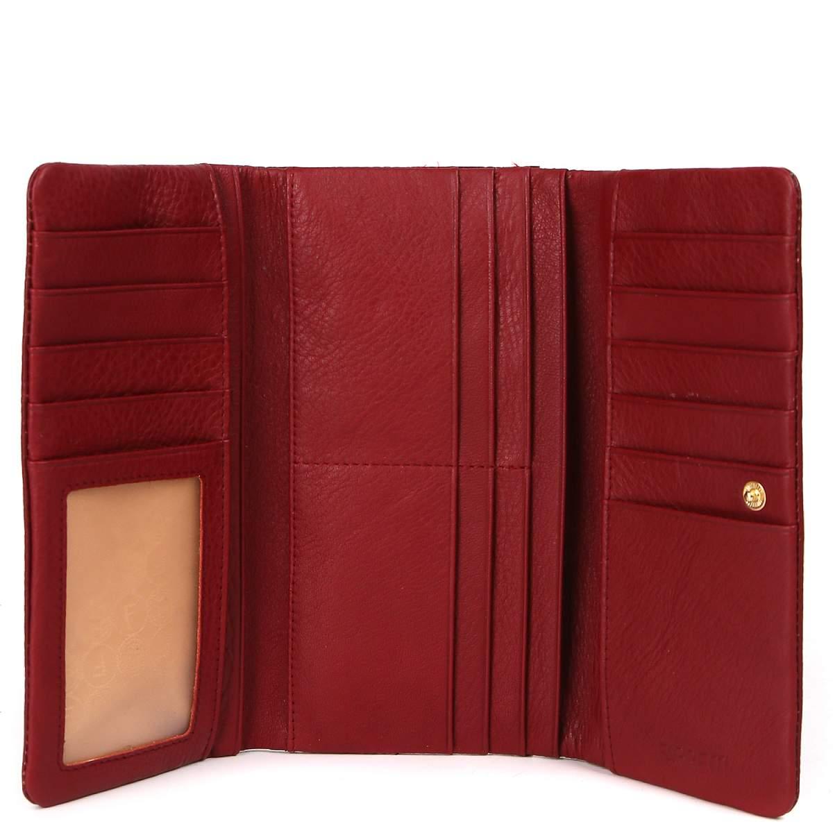 Аксессуар закрывается клапаном с кнопкой и сконструирован по типу книжки. Внутри 3 отделения на полную купюру, 1 вместительный открытый карман, 17 слотов для хранения банковских карт, 1 из которых - с прозрачной вставкой. На тыльной стороне предусмотрен карман быстрого доступа на молнии. Цвет фурнитуры - золото.