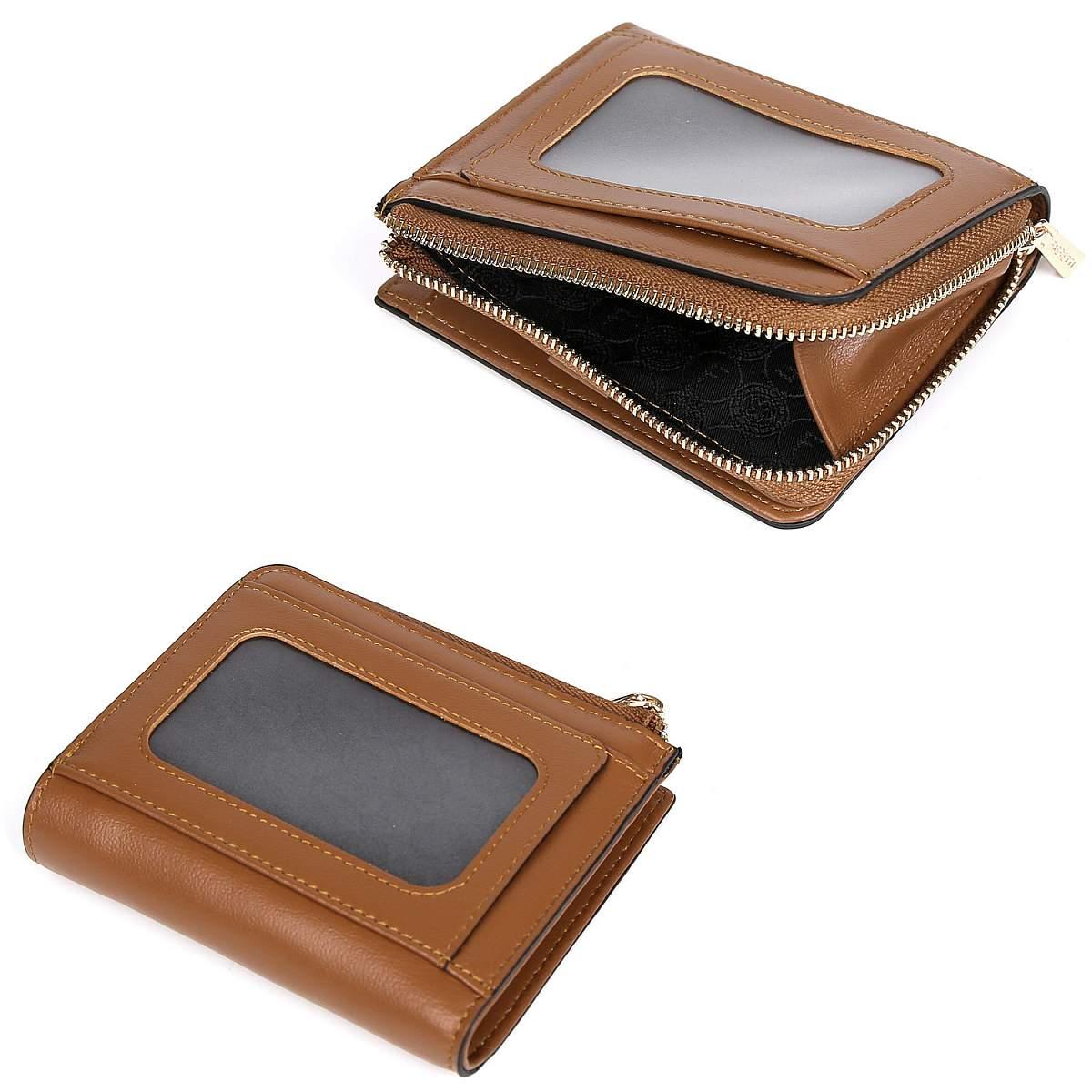 Аксессуар закрывается на клапан с кнопкой. Внутри - 1 отделение для купюр, 6 отделов для дисконтных и банковских карт. Предусмотрен отдельный карман для монет, закрывающийся на полукруглую молнию. На тыльной стороне – 2 отдела для дисконтных карт, один из которых – с прозрачной пластиковой вставкой. Фурнитура под золото гармонично дополняет общий дизайн изделия.