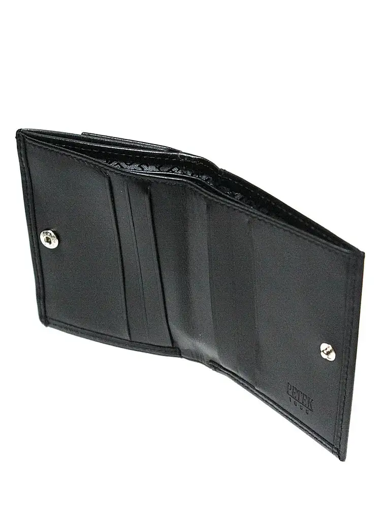 Женское портмоне Petek имеет два отделения для купюр, несколько отделений для пластиковых карт и отделение для мелочи, которое закрывается на кнопку.