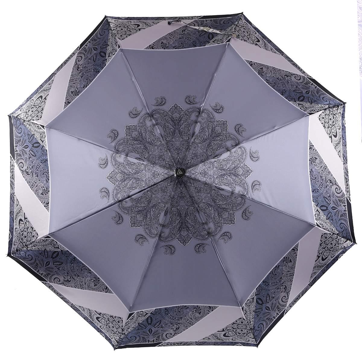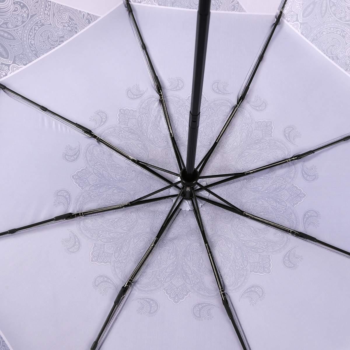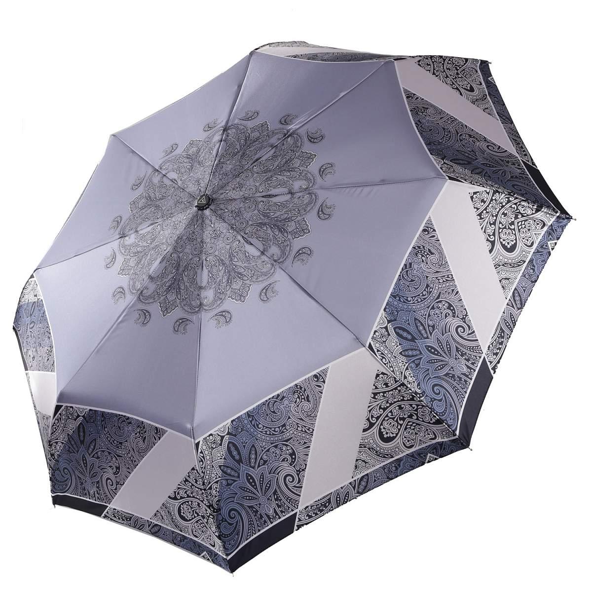 Купол зонта-автомата FABRETTI в серых тонах украшен эффектным принтом «пейсли». Рисунок нанесен с помощью техники цифровой печати, которая обеспечивает долговечность изображению и точность цветопередачи. Купол выполнен из полиэстера с приятной гладкой фактурой и сатиновым блеском. Вода, попадая на такой купол, превращается в капли и легко скатываться вниз.